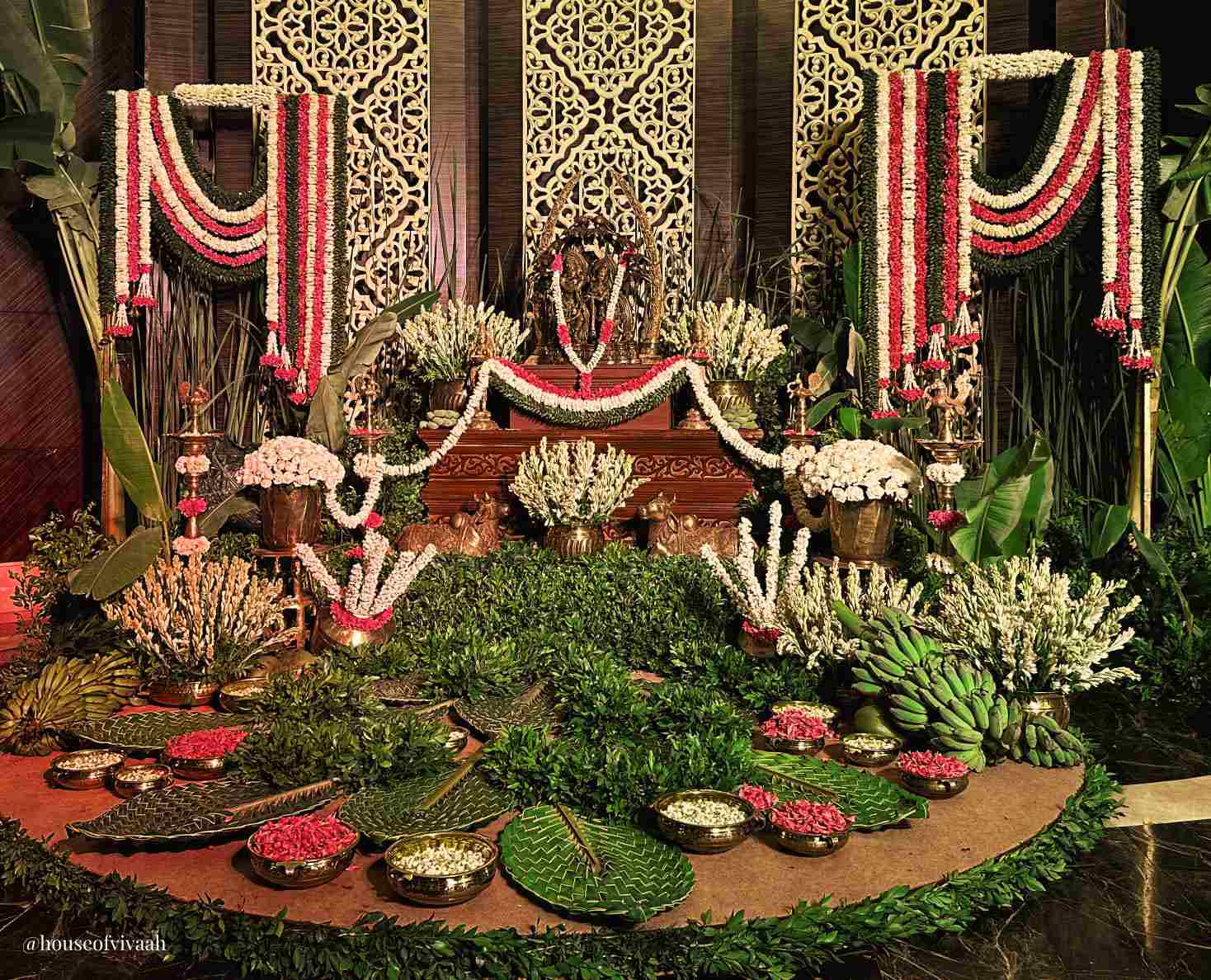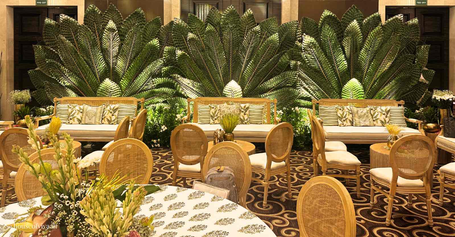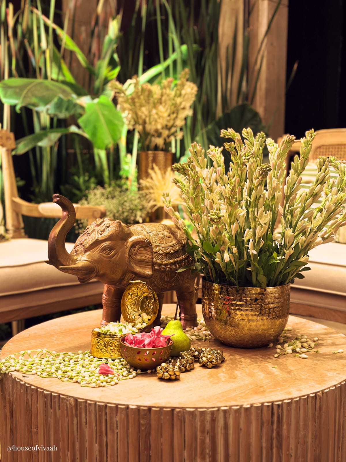 Anant and Radhika's Garba Mehndi decor combines tradition and elegance with floral arrangements, lush greenery, and intricate details. A regal elephant statue and traditional motifs enhance the cultural richness, while chandeliers and sophisticated table settings add luxury. A stunning entrance arch adorned with flowers invites guests into a magical celebration, creating a timeless atmosphere.