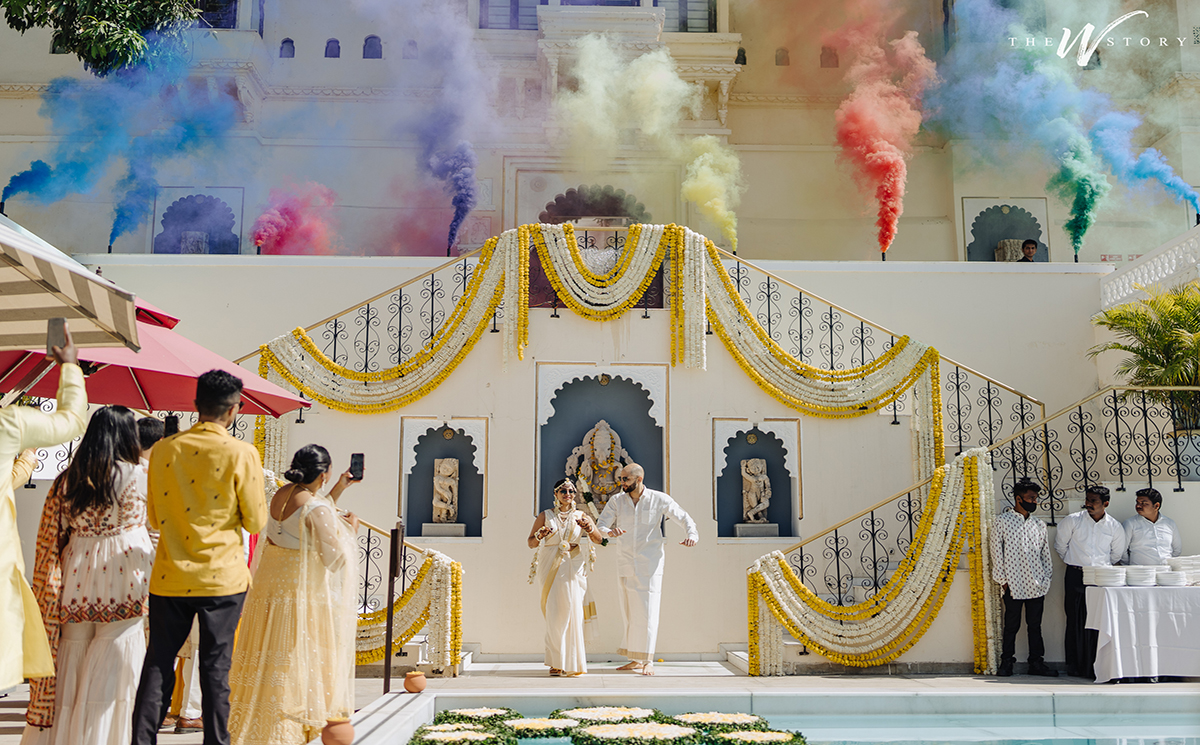 Anu and Sunder's Haldi ceremony was a special gathering by the lakeside, filled with warmth and joy. The decor was simple yet meaningful, with a cozy seating area surrounded by yellow marigold flowers. This setting brought a sense of comfort and tradition to the celebration. The backdrop of the calm lake and distant hills created a peaceful atmosphere. The ground was covered with marigold petals, adding a touch of nature to the space. Small details, like the flower arrangements and greenery, added a personal touch to the event.